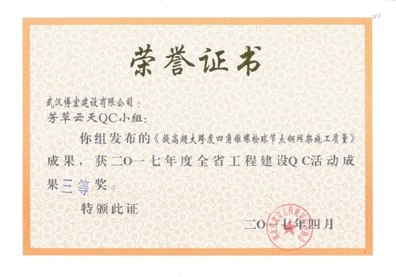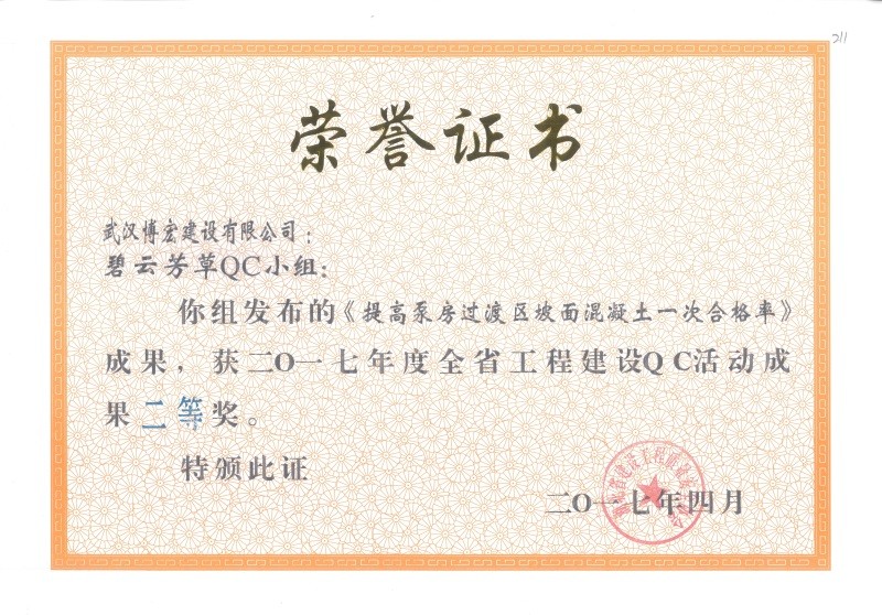 2017年武漢市地區建筑QC活動成果優秀獎(博宏先鋒小組)