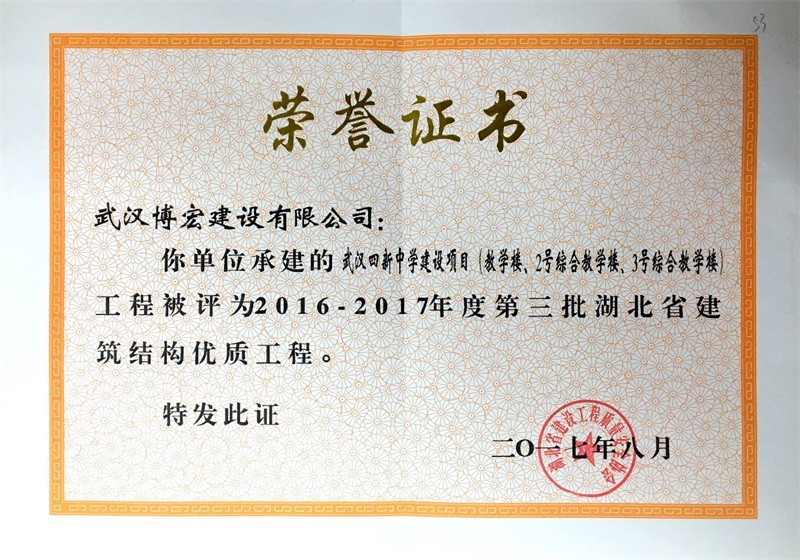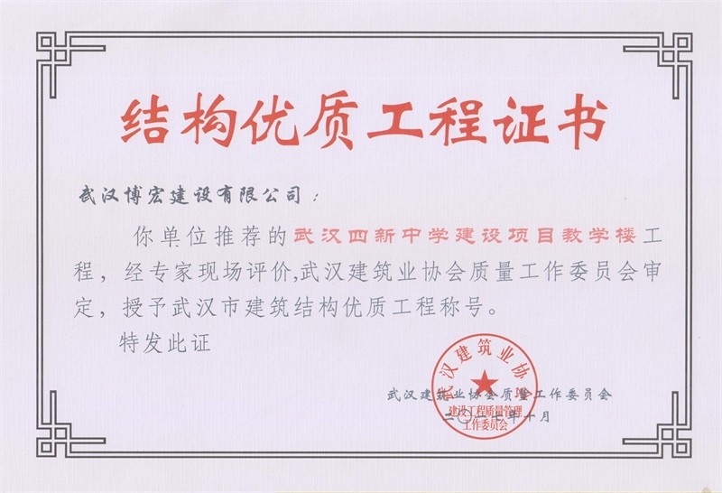 結構優質工程證書(武漢四新中學綜合1號、2號學生公寓及食堂樓)