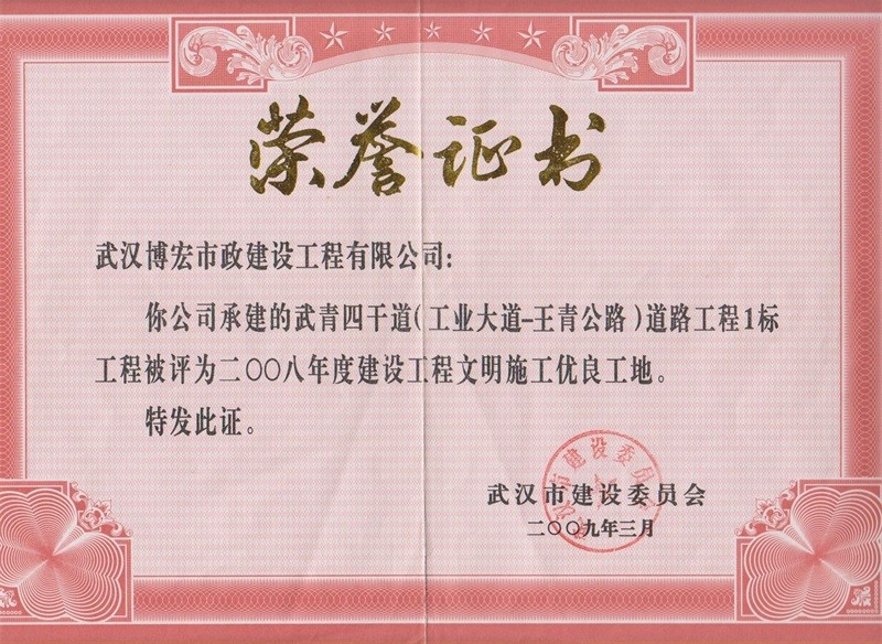 2008年度武漢市建設工程文明施工優良工地(武青四干道道路工程一標)