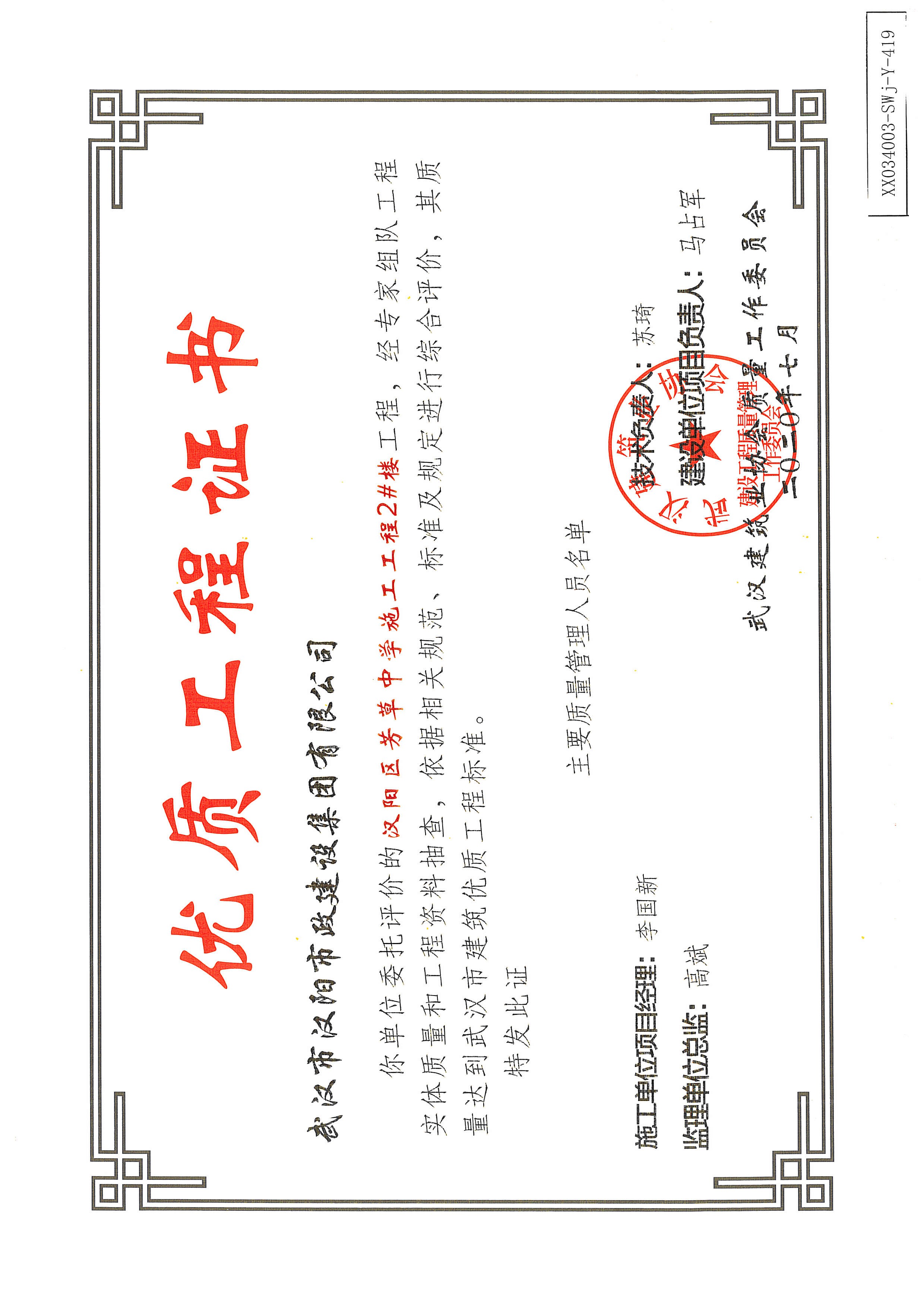 優質工程證書(武漢四新中學建設項目工程(綜合教學1--4號樓)