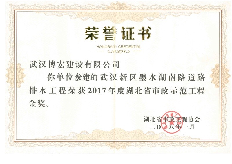 2017年度湖北省市政示范工程金獎(墨水湖南路道排)