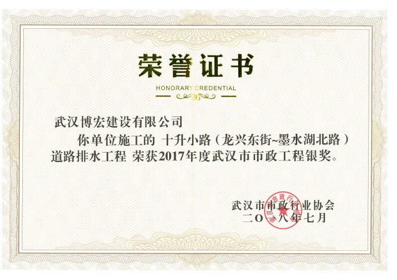 2017年度武漢市市政工程銀獎(十升小路(龍興東街~墨水湖北路)道排工程)