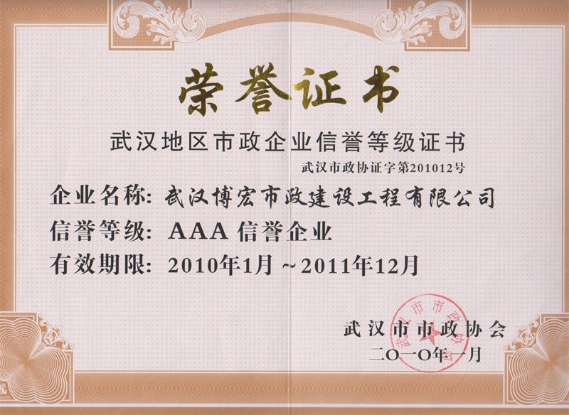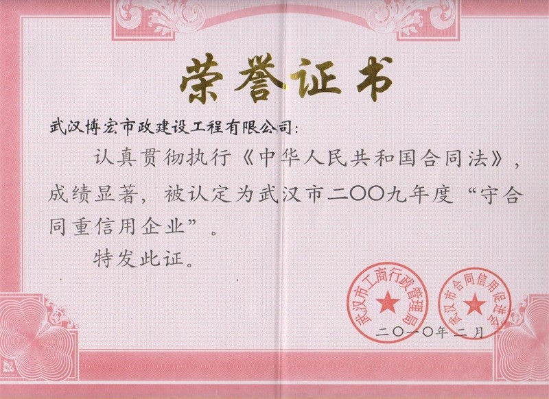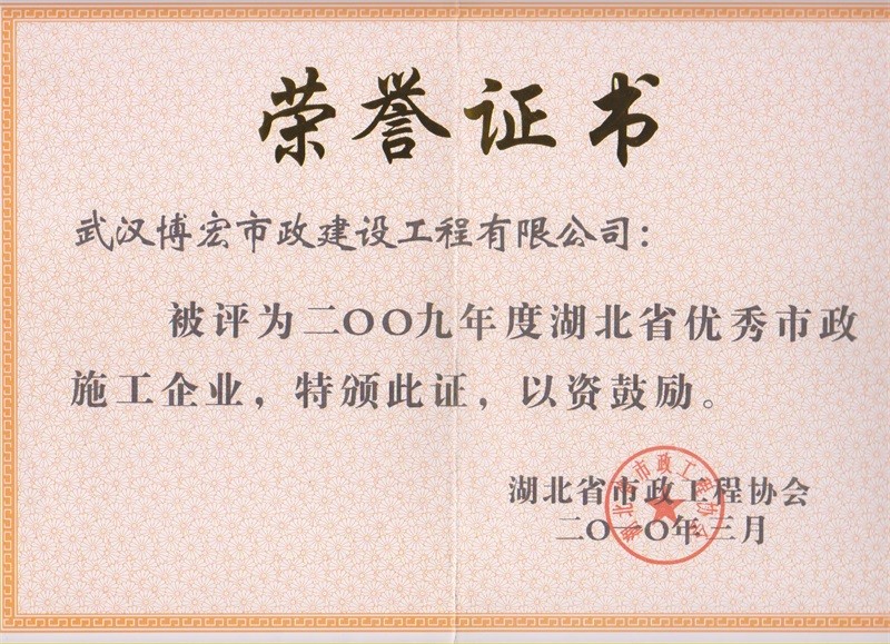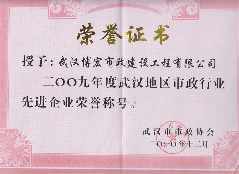 2009年度武漢地區市政行業先進企業榮譽稱號