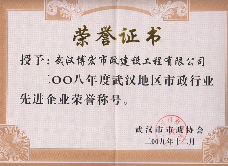 2008年度武漢地區(qū)市政行業(yè)先進(jìn)企業(yè)榮譽(yù)稱號