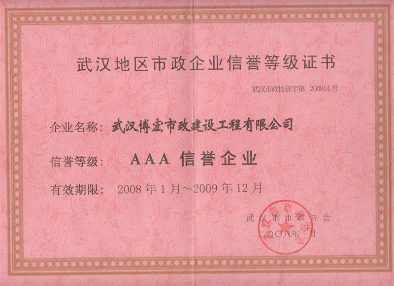 2008-2009年度武漢地區(qū)市政企業(yè)信譽(yù)等級證書(AAA信譽(yù)企業(yè))