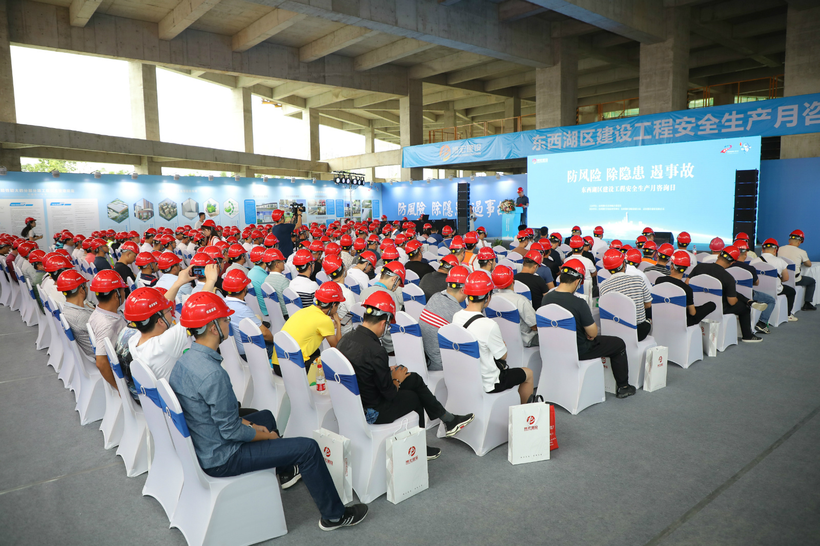 ??? 6月16日,東西湖區(qū)屬建筑施工企業(yè)和在建工程管理人員共計(jì)260余人相聚在武漢食品檢驗(yàn)檢測中心項(xiàng)目現(xiàn)場,通過觀摩現(xiàn)場安全文明情況、領(lǐng)取安全文明手冊、咨詢安全管理問題、問卷調(diào)查、觀看安全生產(chǎn)警示教育片等方式共同參與到本次安全生產(chǎn)月活動(dòng)中來。此次活動(dòng)呈現(xiàn)兩大亮點(diǎn):一是播放宣傳片更加貼近生活,往年的宣傳片,多半是建筑施工安全、消防安全等傳統(tǒng)教育類視頻,今年活動(dòng)圍繞安全生產(chǎn)和文明施工,專門制作了《防線》、《體育中心安全文明》、《創(chuàng)杯項(xiàng)目錦集》三部宣傳片,展示了武漢市優(yōu)質(zhì)大型項(xiàng)目在施工管理上的好做法,使來賓能從中找到共鳴;二是新增了現(xiàn)場問卷答題,更注重互動(dòng)性與參與性,答完題后邀請專家現(xiàn)場解答互動(dòng),對安全管理的工作疑慮進(jìn)行了有效溝通。