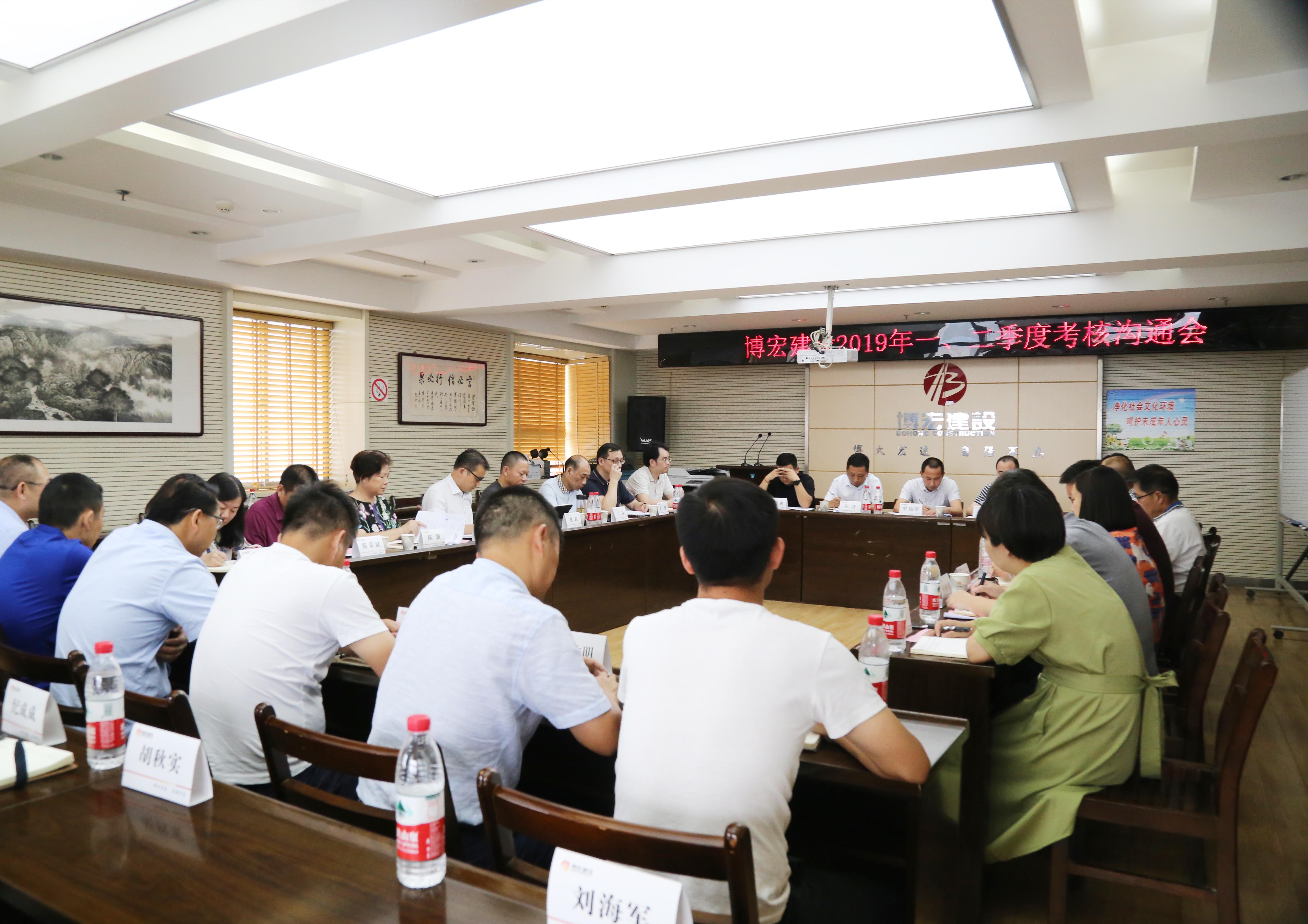 ?????????? 7月9日下午2:30,公司2019年一、二季度考核溝通會順利召開,會議就博宏建設(shè)上半年考核工作目標(biāo)完成情況進(jìn)行了分析和交流,并就下半年工作思路進(jìn)行進(jìn)一步明確。漢陽市政集團(tuán)公司黨委班子、各科室負(fù)責(zé)人、博宏建設(shè)支部班子、各部門負(fù)責(zé)人、項(xiàng)目經(jīng)理及技術(shù)負(fù)責(zé)人共計(jì)40余人參加了此次會議。