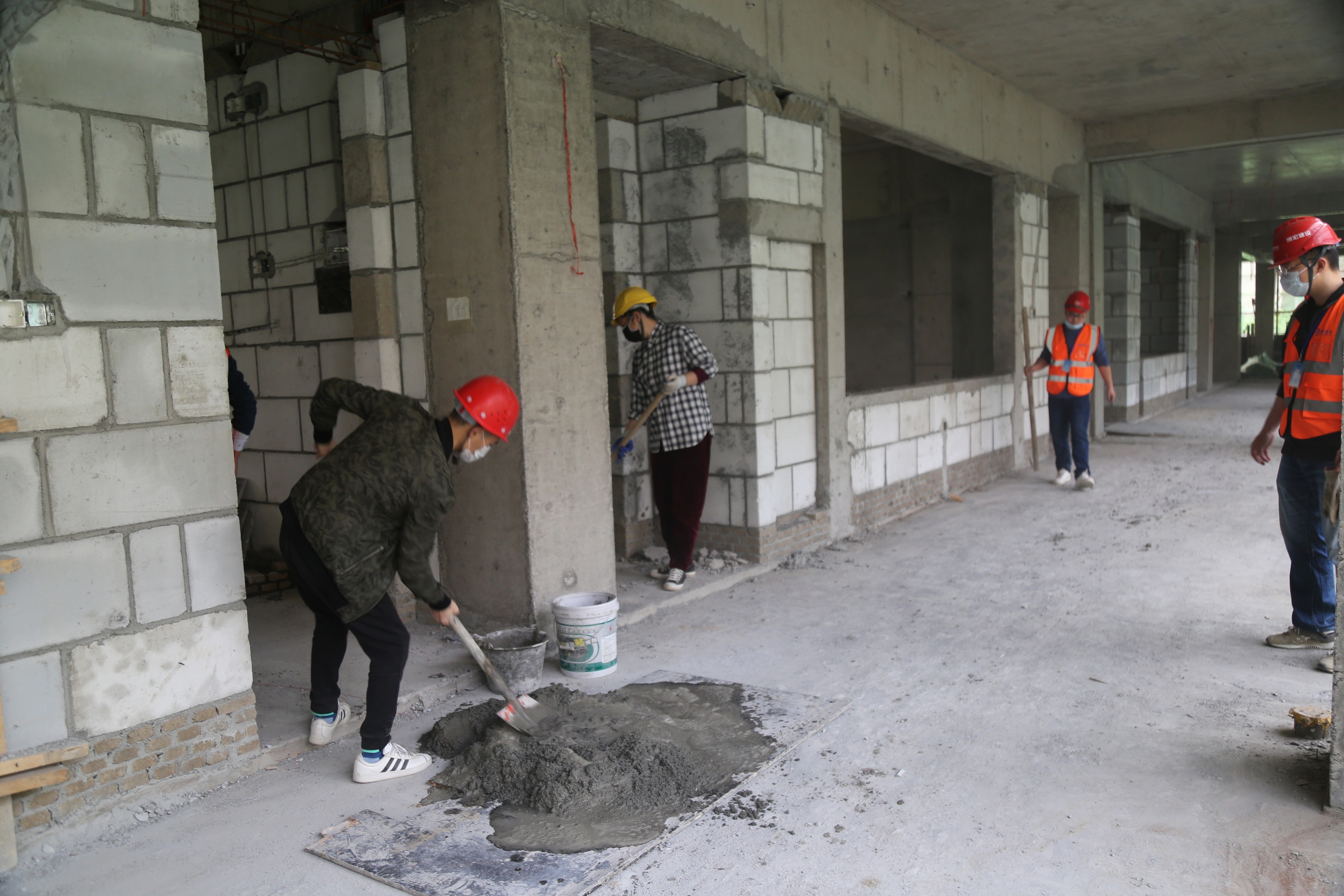 據(jù)項(xiàng)目負(fù)責(zé)人介紹,目前龍陽(yáng)中學(xué)項(xiàng)目已到崗工人60余人,當(dāng)下主要施工任務(wù)是部分樓棟進(jìn)行內(nèi)架拆除、砌體施工、水電安裝等。在經(jīng)過(guò)嚴(yán)格的場(chǎng)地消毒、進(jìn)場(chǎng)測(cè)溫和登記等防疫程序后,現(xiàn)場(chǎng)管理人員和工人們陸續(xù)進(jìn)場(chǎng),一進(jìn)場(chǎng)大家就忙活起來(lái)了,有的及時(shí)對(duì)地面凹陷進(jìn)行覆蓋,有的在上樓為墻面砌筑拌灰,旁邊樓棟里也傳來(lái)了“當(dāng)當(dāng)當(dāng)”的鋼管架子拆除聲音。大家對(duì)期盼已久的復(fù)工都干勁十足,項(xiàng)目起步就是沖刺,開啟“白+黑”兩班倒模式,已連續(xù)兩個(gè)夜晚進(jìn)行施工,誓要把因疫情耽誤的工期盡快趕上。