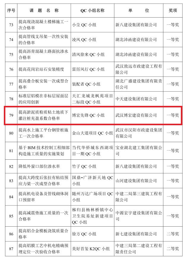 每年,公司都根據(jù)各大在建項目的實際情況,針對生產(chǎn)中的難題,從挖潛增效、強化管理等角度確定課題,成立相關(guān)技術(shù)攻關(guān)小組,構(gòu)思切實可行的質(zhì)量提升措施,并邀請技術(shù)專家對其進行指導完善。本次獲得一等獎的《提高淤泥質(zhì)粉質(zhì)粘土地質(zhì)下灌注樁充盈系數(shù)合格率》,在其攻關(guān)過程中,“博宏先鋒 QC 小組”制定了嚴格的工作計劃和科學的攻關(guān)流程,按月推進,最終形成了一套可復制、可推廣的工作經(jīng)驗,攻關(guān)小組也通過QC活動掌握了一套提升項目管理質(zhì)量的方法論。