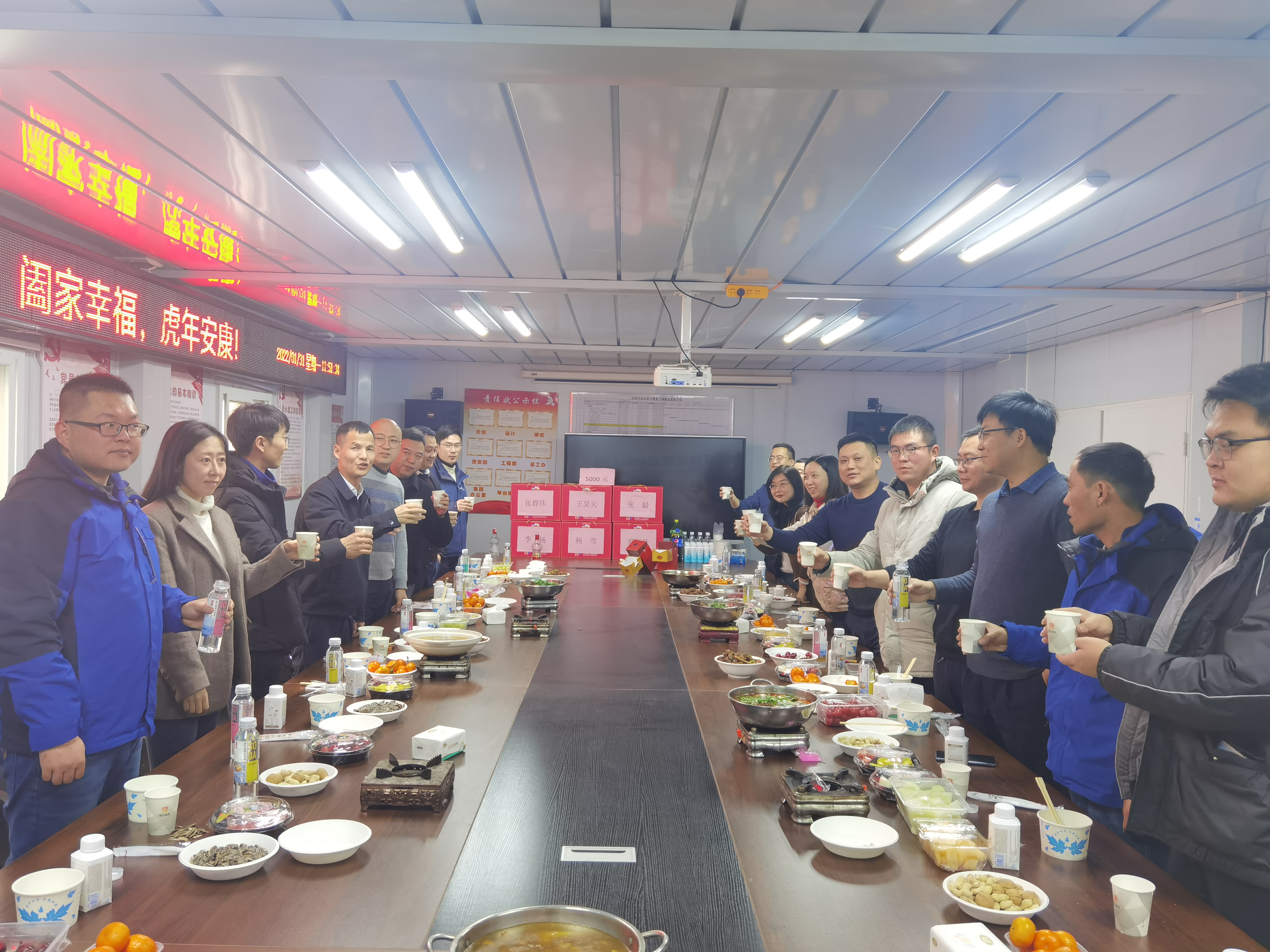 1月31日中午,在除夕這個(gè)特別的日子,在漢陽市政建設(shè)大廈項(xiàng)目部,公司就地過年以及在工地值守的職工圍坐在桌邊,吃了一頓熱乎乎的團(tuán)圓飯,陪他們一起吃團(tuán)圓飯的,還有公司黨支部書記、董事長鄒勇,總經(jīng)理蘇琦,黨支部副書記、工會(huì)主席郭一清,副總經(jīng)理奚雷、辛桂華以及總經(jīng)理助理周昌文、王哲、李磊等領(lǐng)導(dǎo)一行。飯桌前,大家如同一家人一起聊聊家常、看看電視,共度美好的除夕佳節(jié)。