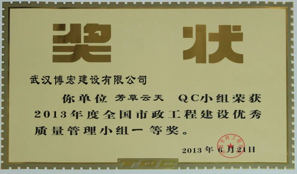 芳草云天QC小組成立于2011年5月31日,本小組從企業經營戰略、方針目標和現場存在的問題出發,以提高效能、降低消耗、實現經濟與社會效益雙贏為目的,全面優化項目質量。歷年來追求卓越、探索新品,曾獲得2013 年全國市政工程建設協會優秀QC成果一等獎、2014年湖北省市政工程建設優秀QC成果二等獎、2015年湖北省市政工程建設優秀 QC成果一等獎、2022年度中國施工企業管理協會工程建設質量管理小組活動成果二等獎、2022年中國建筑業工程建設質量管理小組活動成果三等獎等榮譽。